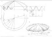 На рис.9 приведено покрытие, которое образовано восемью отсеками эллипсоида – нелинейчатые поверхности переменной положительной кривизны. В целом это перекрытие имеет вид выпуклой, а не вогнутой формы. Отсек этой поверхности образован в результате сечения эллипсоида вращения двумя вертикальными плоскостями и фронтально-проецирующей плоскостью. Линии пересечения отсеков друг с другом – плоские – эллипсы. Примером этого служит аналогичное покрытие, осуществленное при сооружении рыночного павильона в Руайане (Франция), состоящая из тринадцати отсеков.