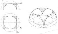 На рис.4 показан парусный свод. Если от полусферического сегмента помимо четырех боковых частей отсечь горизонтальной плоскостью S верхнюю часть, то получится парусный свод. В результате этого сечения получается горизонтальная окружность, которая опирается на четыре арки. Основой парусного свода является переходная форма от его нижнего квадратного основания к его верхнему цилиндрическому объему.