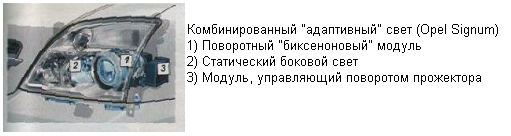 Теперь идея поворотного освещения возрождается - на новом, “электронном”, уровне. Самое простое решение - дополнительная "боковая" лампочка, которая загорается при повороте руля или включенном “поворотнике” на скорости до 70 км/ч - Подобные фары имеют, к примеру, Аudi А8 (первое применение) и Porsche Сауеnnе. Следующая ступень - действительно поворотные фары. В них биксеноновый прожектор с учетом скорости движения, угла поворота руля и угловой скорости автомобиля вокруг вертикальной оси (“датчик поворота”) поворачивается вслед за рулем в пределах 22° - на 15° наружу и на 7° внутрь. Такими фарами оснащаются и ВМW, и Мегсedes, и Lexus, и даже Оре1 Аstra. Третий вариант "адаптивного" света - комбинированный. На высоких скоростях активен только поворотный прожектор, а в медленных поворотах или при маневрировании “подключается” статическое освещение (оно имеет больший угол охвата - до 90"), Такими фарами оснащен Оре1 Signum.