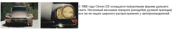 Попытки повернуть фары автомобиля вслед за рулем люди начали предпринимать сразу после появления самих фар. Ведь это удобно - освещать ту часть дороги, куда ты едешь. Однако механическая связь фар и руля не позволяла соотносить угол поворота лучей со скоростью движения, и правила начала века "адаптивный" свет просто запрещали. Попытку возродить оригинальную идею осуществила фирма Cible. В 1967 французы представили первый механизм динамической регулировки угла наклона фар, а через год на Citroen DS начали ставить поворотные фары дальнего света.