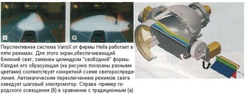Но, пожалуй, самая интересная из разработок - это VARILIS: система, которую Нella разрабатывает вместе с несколькими автопроизводителями. Сокращение расшифровывается как Variable Intelligent Iignting system. Одна из вариаций - система VarioX, которая позволяет фаре работать в пяти режимах света. Для этого в "ксеноновом" прожекторе вместо экрана, включающего ближний свет, находится цилиндр сложной формы. Смена режимов света происходит при вращении цилиндра. Так, например, в городе фары светят близко, но широко, а на трассе ближний свет немного изменяет форму пучка - для большей дальнобойности. Ожидается, что к серийному производству VarioX будет готов в 2006 году. А чуть позже европейские правила позволят связать фары с системой GPS. Одной из первых такую разработку представила ВМW в 2001 году. Вспомните концепт-кар Х-Соuре с асимметричным дизайном. Фары у него поворачивались по команде GPS-навигатора с учетом скорости движения, угла поворота руля и бокового ускорения. А еще навигационная система позволит "предугадывать" повороты и давать команду на автоматическое изменение светораспределения, скажем, при пересечении английской границы - ведь система VarioX позволяет и это!