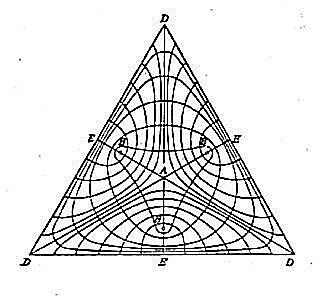 Рис.1 картина напряжений в стелянном треугольнике, полученная Джеймсом при помощи поляризованного света.