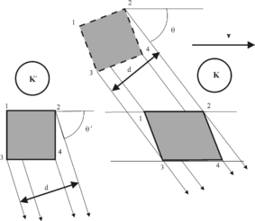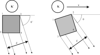 Полученное соотношение можно с успехом использовать для описания видимой формы движущегося объекта. Пусть мимо нас со скоростью v, параллельной оси x, пролетает куб, ориентированный по осям x,y,z или x',y',z'.