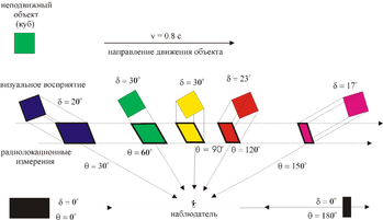 Критики СТО ограничиваются, как правило, анализом эффектов "сокращения" масштабов движущихся тел и "замедлением" времени. К сожалению, они не принимают во внимание, что движущийся объект пролетает мимо них со скоростью v, и наблюдатель вынужден будет рассматривать этот объект под различными углами наблюдения как показано на рис.1