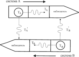 ТА и TВ - интервалы времени, измеренные в собственных ИСО, являющиеся характеристиками сущности; Т'A и Т'B - интервалы времени, наблюдаемые их "чужих" систем (явления).
