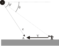 Причина отличия от' видна из рис 2. В системе K' наблюдатель и световой луч будут двигаться к общей точке встречи А. Только в этой точке наблюдатель увидит этот световой луч.
