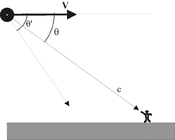 Угол образован двумя векторами: вектором скорости движущегося тела и вектором, направленным вдоль светового луча от движущегося источника к наблюдателю. Теоретически он может меняться от 0 до 180 градусов в системе отсчета K, связанной с наблюдателем. В системе отсчета, связанной с движущимся объектом, этот луч будет иметь другое направление, т.е. идти под другим углом. Обозначим этот угол как '.
