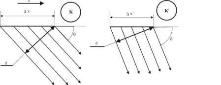 Величина d это толщина светового луча. Она сохраняется постоянной в любой инерциальной системе отсчета. Если учесть, что ширина этого луча не зависит от выбора инерциальной системы отсчета, можно сформулировать закон "преломления" света при переходе наблюдателя из одной инерциальной системы отсчета в другую. Световой луч "поворачивается" на угол = - ' и меняет частоту колебаний.