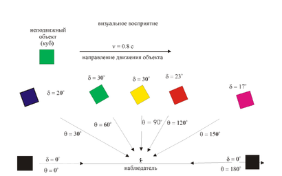 Описанная выше визуальная форма движущегося куба есть сугубо субъективное явление, полученное при участии головного мозга, т.е. иллюзия. Это субъективная кажимость (как говорят: "обман зрения"). Теперь необходимо рассмотреть объективную кажимость (объективное явление), т.е. то, что мы будем измерять на самом деле.