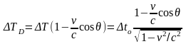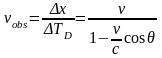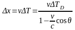 Введем угол θ, образованный двумя векторами: вектором скорости v, направленным вдоль оси x, и вектором направления световых лучей от движущегося объекта к наблюдателю. Благодаря эффекту Доплера наблюдаемый интервал между световыми вспышками будет также зависеть от угла наблюдения θ. Учитывая искажение интервалов времени эффектом Доплера, найдем наблюдаемый интервал времени между вспышками, которые видны под углом θ в системе К. Он равен: