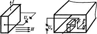 Если специальную полупроводниковую пластину, по которой течёт ток I (показан пунктиром на рис. 4, а), возбуждаемый электрическим полем напряженностью E, поместить в магнитное поле с напряженностью H (индукцией В), то между ее точками, лежащими на прямой, перпендикулярной направлениям протекающего тока I и магнитного поля, возникает разность потенциалов (эффект Холла), определяемая как