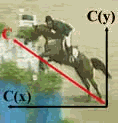 еперь более подробно рассмотрим механику прыжка.При прыжке лошадь совершает движение подобно брошенному под углом телу (см. рис. 2). Ее начальная скорость С, в момент отталкивания состоит из горизонтальной составляющей С(x), т.е. скорости с которой лошадь двигается перед прыжком, и вертикальной составляющей С(y) в момент отталкивания, которая в каждую секунду уменьшается на величину свободного падения g=9,8м/сек. Перемещение происходит по параболе, а сопротивлением воздуха можно принебречь.