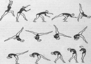 Курбет (рис. 230), то есть прыжок с рук на ноги, напоминает вторую половину переворота назад. Махом одной и толчком другой ногой сделать стойку на руках. Не доходя до стойки, прогнуться и согнуть ноги в коленных суставах. Занимающийся должен почувствовать, что растянулись мышцы передней поверхности тела. Далее следует быстрый разгиб ног в коленных суставах и торможение. После толчка руками от пола происходит резкое сгибание в тазобедренных суставах, а затем поднимание плеч. Полет заканчивается приземлением на носки прямых ног в положение, близкое к прямому (руки вверху), и выполняется прыжок вверх с небольшим продвижением назад.