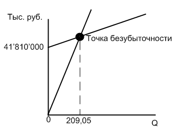 Точка безубыточности = постоянные затраты / (цена изделия (1шт.) -переменные затраты) = 41’810’000 / (150’000 - 1’300’000) = 209,05
