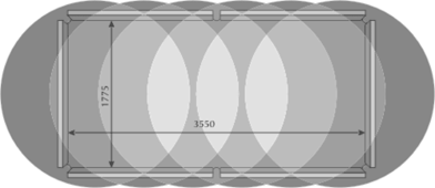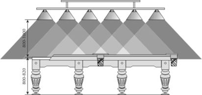 Учитывая светотехнические характеристики, а также эргономические требования, на рисунках изображена оптимальная схема расположения бильярдного светильника относительно игрового поля бильярда с учетом охвата световым потоком зоны не уже угловых луз. В зависимости от мощности электрических ламп, используемых в светильниках, высота от кромки плафонов до игрового поля варьируется в пределах 800-1000 мм. Такая схема позволяет при использовании ламп накаливания мощностью 100 Вт достичь равномерного заполнения световым потоком игровой поверхности освещенностью в 300 лк минимум.