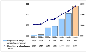 Рисунок 4‑1 Потребность в грузовых автомобилях и тормозных барабанах в России, тыс. шт