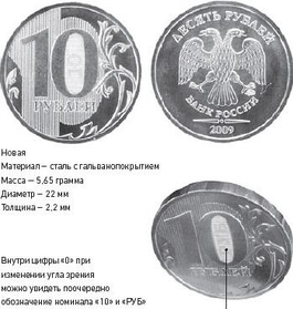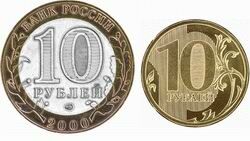 Новые десятирублевые монеты сделаны из стали с применением гальванического покрытия. По сравнению со старыми монетами размер и вес новых монет уменьшится: вес составит 5,65 г вместо прежних 8,5 г. Диаметр составит 22 мм, толщина 2,2 мм. В частности, на оборотной стороне монеты есть участок с рельефом в виде вертикальных линий, а внутри цифры "0" обозначения номинала есть видимые поочередно при изменении угла зрения изображения: цифра "10" и надпись "РУБ". Гурт монеты имеет чередующиеся участки трех типов: без рифов, с семью тонкими рифами и пятью широкими рифами.