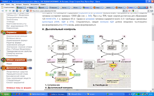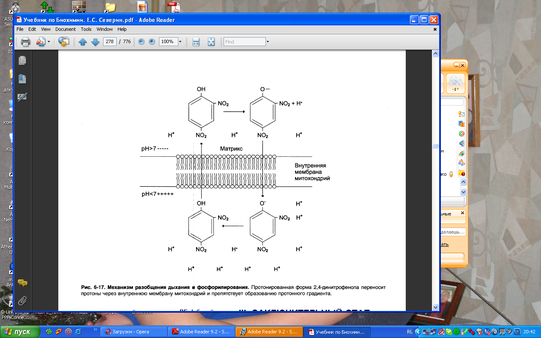 Антибиотик Олигомицин полностью блокирует окисление и фосфорилирование в интактных митохондриях. Однако, если вместе с олигомицином добавить разобщитель динитрофенол, то окисление пойдет, но без фофорилирования. Это означает, что олигомицин не действует непосредственно на ыхательную цепь, а подавляет стадию фосфорилирования. Разобщители переносят протоны через внутреннюю митохондриальную мембрану. Перенос от НАДФ к О2 в присутствии таких разобщителей протекает нормально, но образования АТФ митохондриальной АТФ-азой не происходит, поскольку исчезает протонодвижущая сила, обуславливающая перенос протонов через внутреннюю мембрану митохондрий. Потеря дыхательного контроля приводит к тому, что поглощение О2 и окисление НАДФ повышается. В то же время ДНФ не оказывает влияния на субстратное фосфорилирование. В силу своего специфического действия на дыхательную цепь ДНФ и другие разобщители служат ценным инструментом при исследованиях обмена веществ.