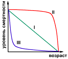 Характер возрастной структуры (или как говорят, возрастного спектра) популяции зависит от типа так называемой кривой выживания, свойственной данной популяции. Кривая выживания отражает уровень смертности в различных возрастных группах. Так, если уровень смертности не зависит от возраста особей, то кривая выживания представляет собой снижающуюся линию (см. рисунок, тип I). То есть отмирание особей происходит в данном типе равномерно, коэффициент смертности остается постоянным на протяжении всей жизни. Такая кривая выживания свойственна видам, развитие которых происходит без метаморфоза при достаточной устойчивости рождающегося потомства. Этот тип принято называть типом гидры - для нее свойственна кривая выживания, приближающаяся к прямой линии.