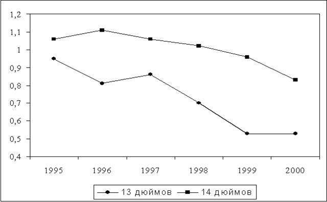 Рис.1 Изменение удельного нормативного расхода текстильного корда на легковую покрышку 13" и 14".
