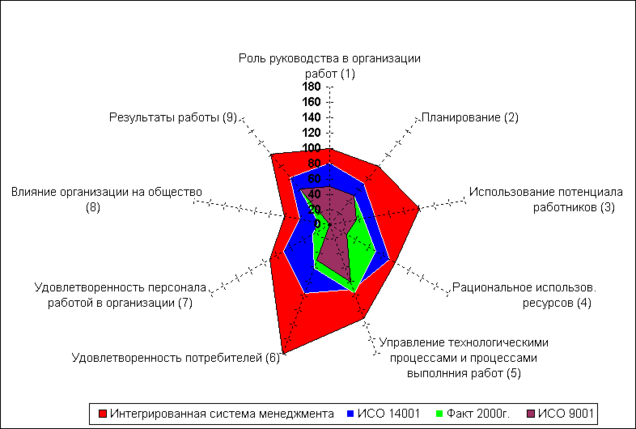 Диаграмма составлена по результатам самооценки деятельности предприятия на соответствие критериям Российской премии по качеству, в основу которых положены принципы создания Интегрированной системы менеджмента (Total Quality Management)[3]. Представленные на диаграмме 9 критериев подразделяются на две основные группы: критерии характеризующие Возможности предприятия (1-4) и критерии, характеризующие Достигнутые результаты (5-9). На рис. 5 показано возможное расширение деятельности и достигаемых результатов за счет внедрения системы экологического менеджмента. Таким образом основной целью разработки и внедрения системы экологического менеджмента в ОАО "МШЗ" является не столько получение сертификата соответствия требованиям стандарта ISO 14001 (ГОСТ Р ИСО 14001-98), сколько разработка принципиально новых способов управления предприятием, дающих возможность усилить влияние на экологические аспекты деятельности. Внедрение системы экологического менеджмента рассматривается ОАО "МШЗ" как переходный этап на пути создания интегрированной системы менеджмента. При разработке системы экологического менеджмента важное значение для предприятия имеет разработка политики, включающей в себя публично декларируемые принципы и обязательства, связанные с экологическими аспектами производственной деятельности и обеспечивающие основу для установления конкретных экологических целей и задач.