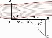 Встаньте против него (точка В), отметьте камнем или палкой эту точку и идите вдоль берега перпендикулярно линии АВ. Сделав определенное количество шагов (например, 30), отметьте рейкой точку С.