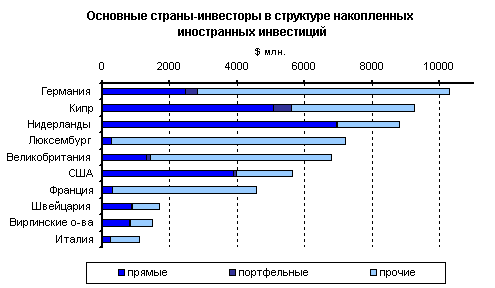 Доля группы основных стран-инвесторов (Германия, США, Кипр, Великобритания, Франция, Нидерланды) в общем объеме накопленных иностранных инвестиций уменьшилась до 68,6% (71% – на конец I полугодия 2003 г.). При этом по прямым инвестициями доля увеличилась до 74,3% (71,8% – на конец I полугодия 2003 г.) от общего объема накопленных прямых иностранных инвестиций.