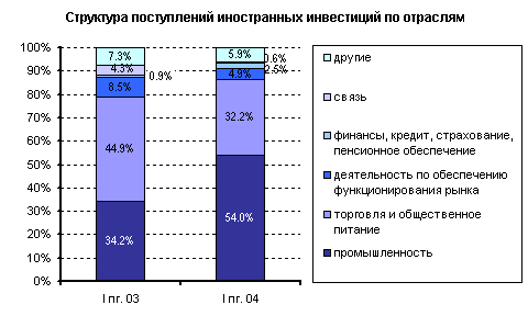 В отраслевой структуре поступлений иностранных инвестиций до 54% от общего объема инвестиций выросла доля промышленности. Всего за данный период в промышленный сектор поступило $10,25 млрд. инвестиций, что в 2,4 раза больше чем в I полугодии 2003 г. При этом объем инвестиций в топливный сектор вырос более чем в 5 раз (!), в результате чего его доля в поступлениях инвестиций в промышленность выросла с до 52% с 24,3%.