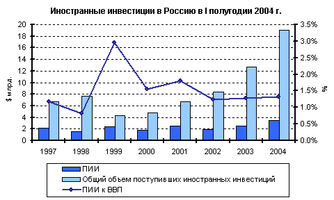 Иностранные инвестиции в экономику России в I полугодии 2004 г.