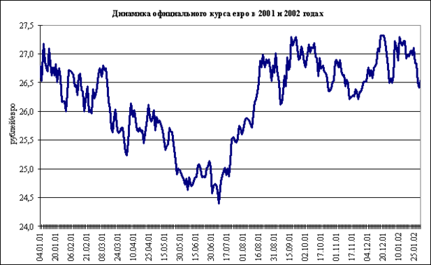 За 2001 год официальный обменный курс рубля снизился на 7,03%, с 28,16 до 30,14 рублей за доллар. Среднегодовой курс рубля к доллару США, по нашим оценкам, составил около 29,18 рублей за доллар.