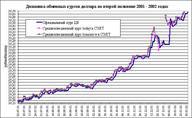 В целом, в январе 2002 года официальный курс доллара вырос с 30,14 руб./доллар до 30,685 руб./доллар, т.е. на 1,81% (24,0% в пересчете на год, см. рисунок 8). Курс доллара ‘today’ в СЭЛТ увеличился с 30,1453 руб./доллар до 30,6774 руб./доллар (на 28 января), что составило 1,77%. Курс доллара ‘tomorrow’ вырос с 30,1646 руб./доллар до 30,6766 руб./доллар (на 28 января), т.е. на 1,70%. Объемы торгов по доллару в СЭЛТ в январе, по предварительным оценкам, не превысили 160 млрд. рублей.