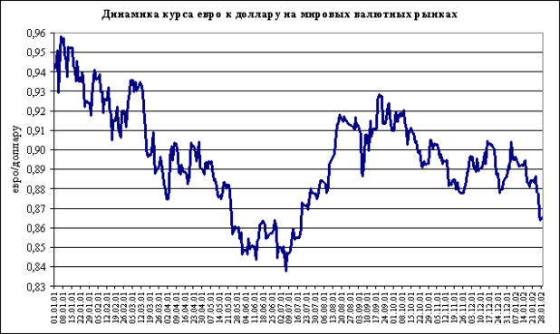 Введение наличного евро, несмотря на положительные комментарии руководства ЕЦБ и европейских стран-членов валютного союза, не оказало значимого влияния на динамику курса европейской валюты на мировых валютных рынках. После кратковременного роста в первые дни нового года, курс евро снова резко упал (см. рисунок 9). К концу января значения курса опустились до минимальных значений с июля 2001 года (около 0,86 $/евро). Основной причиной нового снижения курса единой европейской валюты стало ухудшение макроэкономической ситуации в еврозоне и усиление политических разногласий между членами Европейского Союза (в частности, оппозиционная позиция Италии по вопросу перспектив расширения ЕС).