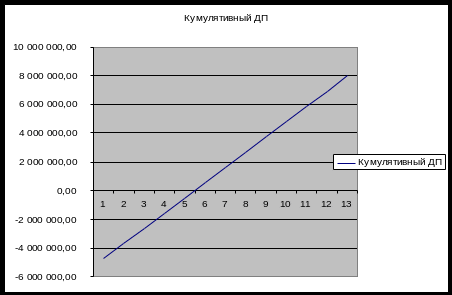 | Кумулятивный ДП | -4 736 800,00 | 2 689 707,20 | 3 750 636,80 | 4 811 566,40 | 5 872 496,00 | 6 933 425,60 | 7 994 355,20 |