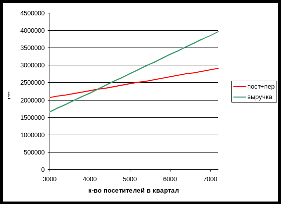 Предположительно, среднее количество посетителей за квартал – 7650 человек. Определение точки безубыточности работы предприятия: