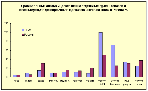 В декабре 2002 год индекс потребительских цен по Ямало-Ненецкому автономному округу на все товары и платные услуги составил 114,8 % к декабрю 2001 года, по РФ - 115,1% (индекс потребительских цен по ЯНАО в декабре 2001 года к декабрю 2000 года - 122,9%, по РФ - 118,6%). Индексы цен на продовольственные товары (включая алкогольную продукцию) - 112,7 %, на непродовольственные товары - 103,6 %, платные услуги - 141,4 процента.