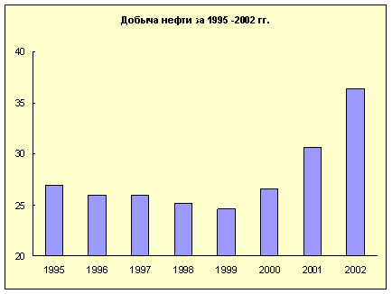 ост производства в топливной промышленности относительно 2001 года составил 108,2%, что обусловлено увеличением объемов добычи нефти и газа. На 1 января 2003 года в нефтедобывающей отрасли насчитывалось 14 предприятий с численностью промышленного персонала более 32,3 тыс. человек. Добыто нефти 36,4 млн. тонн, что на 19,1% больше уровня 2001 года. Прирост добычи нефти обеспечен за счет внедрения новых современных технологий в области бурения добывающих скважин, методов первичного и вторичного вскрытия пластов, сокращения бездействующего фонда.