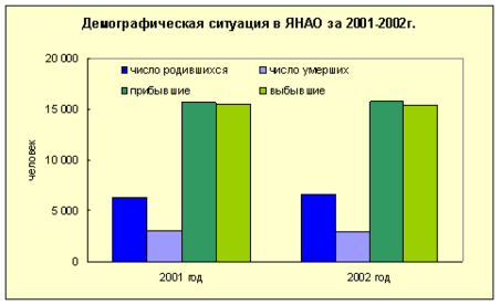 В течение 2002 года в автономный округ прибыло 15783 человек, выбыло 15398 человек, механический прирост составил 475 человек. Миграционный отток отмечен в муниципальных образованиях: г. Надым и Надымский район (320 чел.), г. Лабытнанги (275 чел.), г. Новый Уренгой (206 чел.), Тазовский район (83 чел.).