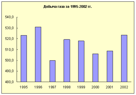 На 1 января 2003 года в газовой отрасли насчитывалось 11 предприятий с численностью промышленного персонала более 44,1 тыс. человек. Добыча природного газа составила 523,5 млрд. куб. м. Прирост добычи газа относительно 2001 года -2,9 процента.