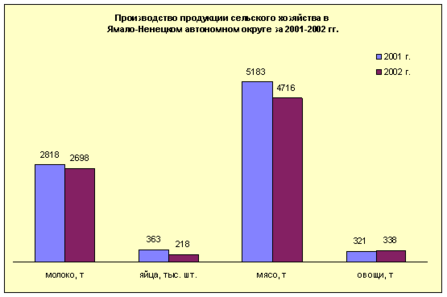 Уменьшение объемов производства мяса скота и птицы связано с увеличением маточного поголовья в оленеводстве для дальнейшего воспроизводства стада, а также неблагоприятными природно-климатическими условиями 2002 год при заготовке грубых кормов.