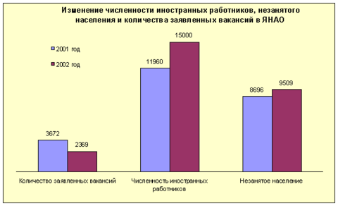 За 2002 год было выдано разрешений более 400 предприятиям на привлечение в производстве иностранной рабочей силы в количестве более 15 тыс. человек. Наибольшая доля иностранной рабочей силы работает в городах Салехард (27% от общего числа привлекаемой рабочей силы), Надым (22%), Новый Уренгой (20%).