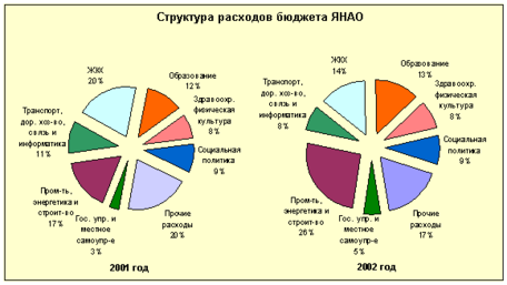 труктура расходов претерпела изменения. Увеличение доли расходов по статье "Промышленность, энергетика и строительство" и снижение по статьям "Жилищно-коммунальное хозяйство", "Транспорт, дорожное хозяйство, связь и информатика" вызвано изменением порядка отнесения капитальных расходов по статьям бюджетной классификации. В 2001 году капитальные расходы отражались по соответствующим статьям функциональной классификации. В 2002 году - по статье функциональной классификации "Промышленность, энергетика и строительство".