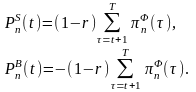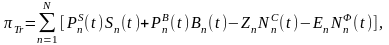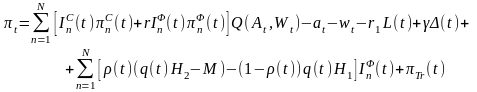 где Zn и En — невозвращаемые затраты при создании собственного и франчайзингового (с учетом вступительного взноса) предприятия, определяемые вне модели, Psn(t), PBn(t) — прибыль от продажи, покупки предприятия, а Sn, Bn, Ncn, Nфn, Lcn, Lфn — индикаторные функции, равные либо нулю, либо единице, отражающие продажу собственной точки во франчайзинг, выкуп франчайзы, создание новой собственной и франчайзинговой точек, ликвидацию собственной и франчайзинговой точек на n-ом участке. Так как цена предприятия равна сумме прибыли, которую может получить франчайзи за оставшееся время, и ликвидационной стоимости, то прибыль франчайзера от сделок (T — горизонт планирования)