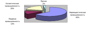 На диаграмме 2 приводится распределение долей потребления дигидрокверцитина различными отраслями промышленности в Российской Федерации. Видно, что основная доля потребителей дигидрокверцитина относится к предприятиям фармацевтической промышленности (65%). Очевидно, что с учетом более низкой стоимости дигидрокверцитина, получаемого из лиственницы даурской и наличия большого и растущего числа компаний, использующих дигидрокверцитин при производстве БАДов, размер рынка сбыта продукции ЗАО «Аметис» может быть значительно увеличен. Этим предприятиям легко сделать выбор в пользу дигидрокверцитина с высокой степенью чистоты и более низкой стоимости.
