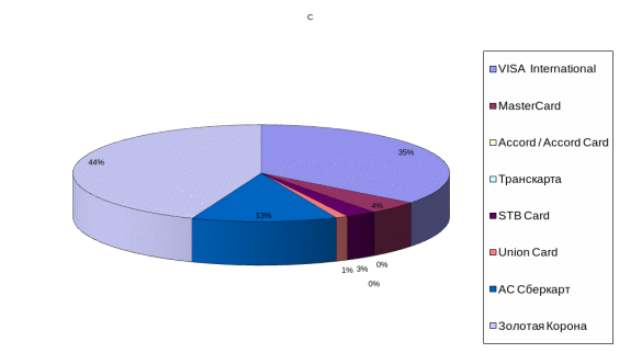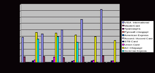 Анализируя сумму сделок, совершенных в торгово-сервисной сети по пластиковым картам видно, что за анализируемый период АС Сберкарт , даже снизил свои позиции по сравнению с прошлым периодом. Это связано с тем, что пластиковые карты АС Сберкарт не принимаются в полном объеме торговыми сетями для оплаты услуг, а большее предпочтение у населения располагают VISA International