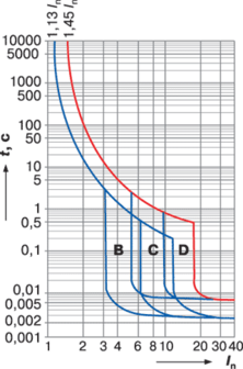 Важную роль играет время срабатывания электромагнитных расцепителей автомата при КЗ. ГОСТ Р 5034599 [3], а также аналогичные зарубежные документы, к сожалению, содержат лишь требование о том, что время действия автоматических выключателей в начальной зоне отсечки («время мгновенного расцепления») должно быть менее 0,1 с.