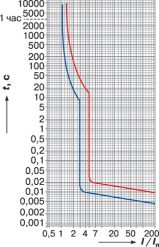 Анализируя защитные времятоковые характеристики автоматических выключателей (рис. 2), мы видим две области: область работы отсечки, предназначенной для отключения токов КЗ, и область работы тепловых расцепителей, предназначенных для защиты от перегрузки.