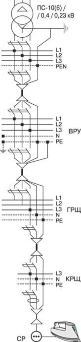 Рассмотрим характерную схему электроснабжения жилого здания (рис. 1). Источник питания – это, как правило, отдельно стоящая ПС со своим распределительным щитом 10(6)/0,4/0,23 кВ. На вводе в здание расположено вводнораспределительное устройство – ВРУ0,4/0,23 кВ. Следующая ступень – этажный групповой распределительный щиток (ГРЩ), последняя ступень – квартирный распределительный щиток (КРЩ). Упомянутые распредустройства связаны между собой проводниками, минимально допустимые сечения которых указаны в ПУЭ. Номинальные токи аппаратов, защищающие кабели и провода как от токов КЗ, так и от перегрузки, выбираются в соответствии c ПУЭ.