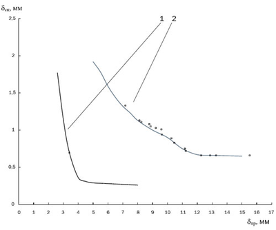 Рис. 2. Зависимости толщины сухого слоя краски «Нуллифаер» от приведенной толщины