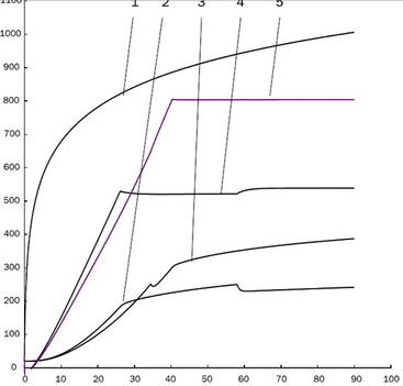 Рис. 5. Зависимости температур от времени 1 – среднеобъемная температура при