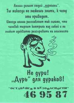 ПРОФИЛАКТИКА НАРКОМАНИИ в молодежной среде подразумевает работу в двух направлениях: 1) улучшение информированности подростков о факторах риска, создаваемых наркоманией для здоровья и для личности в целом и 2) содействие в становлении здорового образа жизни. Учитывая особенности подросткового возраста, когда информация, исходящая от взрослых — педагогов, родителей — не столь значима, важна негативная установка в отношении наркотиков, высказанная самими детьми.